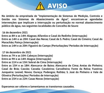 Interrupção do Abastecimento de ÁguaVitor Miranda10 de Dezembro, 2021Informam-se os utilizadores do Norte da Praia de Mira, concelho de Mira, que podem verificar-se períodos de interrupção do abastecimento ... Ler mais