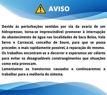 Informam-se os utilizadores de Moinho de Almoxarife, concelho de Soure, que vão verificar-se períodos de interrupção do abastecimento de água, ... Ler mais