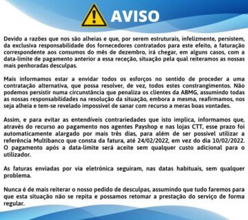 Interrupção do Abastecimento de ÁguaVitor Miranda8 de Fevereiro, 2022Informam-se os utilizadores de Meãs de Cima, concelho de Montemor-o-Velho, que podem verificar-se períodos de interrupção do abastecimento de água, ... Ler mais