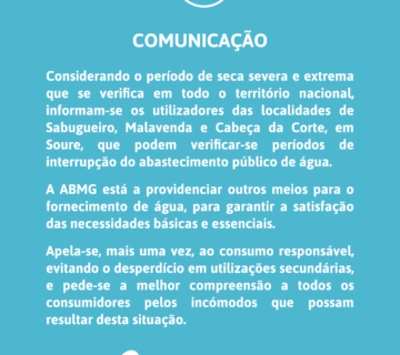 Interrupção do normal Abastecimento Público de ÁguaVitor Miranda24 de Agosto, 2022Corte de água nas Meãs até cerca das 22h30 em virtude da reparação de uma rotura. Pede-se, assim, a melhor ... Ler mais