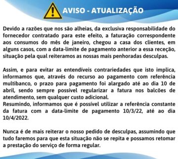 Interrupção do normal Abastecimento Público de ÁguaVitor Miranda4 de Abril, 2022No âmbito da empreitada de «Implementação de Sistemas de Medição, Controlo e Gestão dos Sistemas de Abastecimento de Água», a ... Ler mais