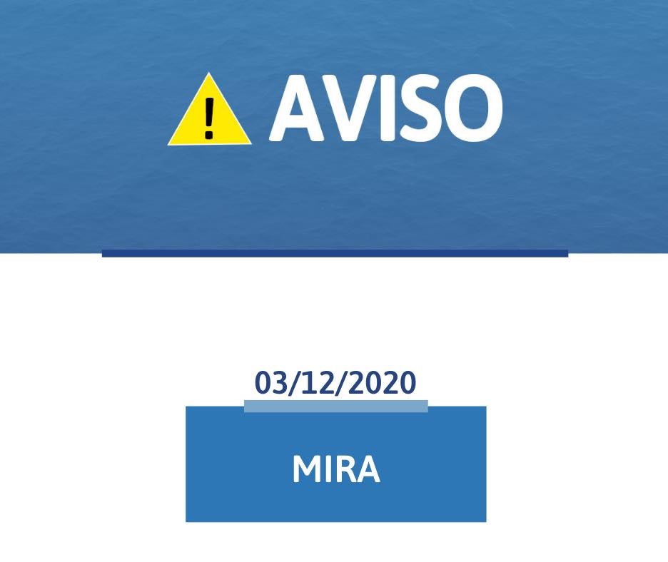 Informam-se os utilizadores da Rua da Floresta e da Zona Industrial Polo I e Polo II, concelho de Mira, que podem verificar-se períodos de interrupção do abastecimento de água, até às 18H00, do dia 03/12/2020, em consequência de uma rotura.