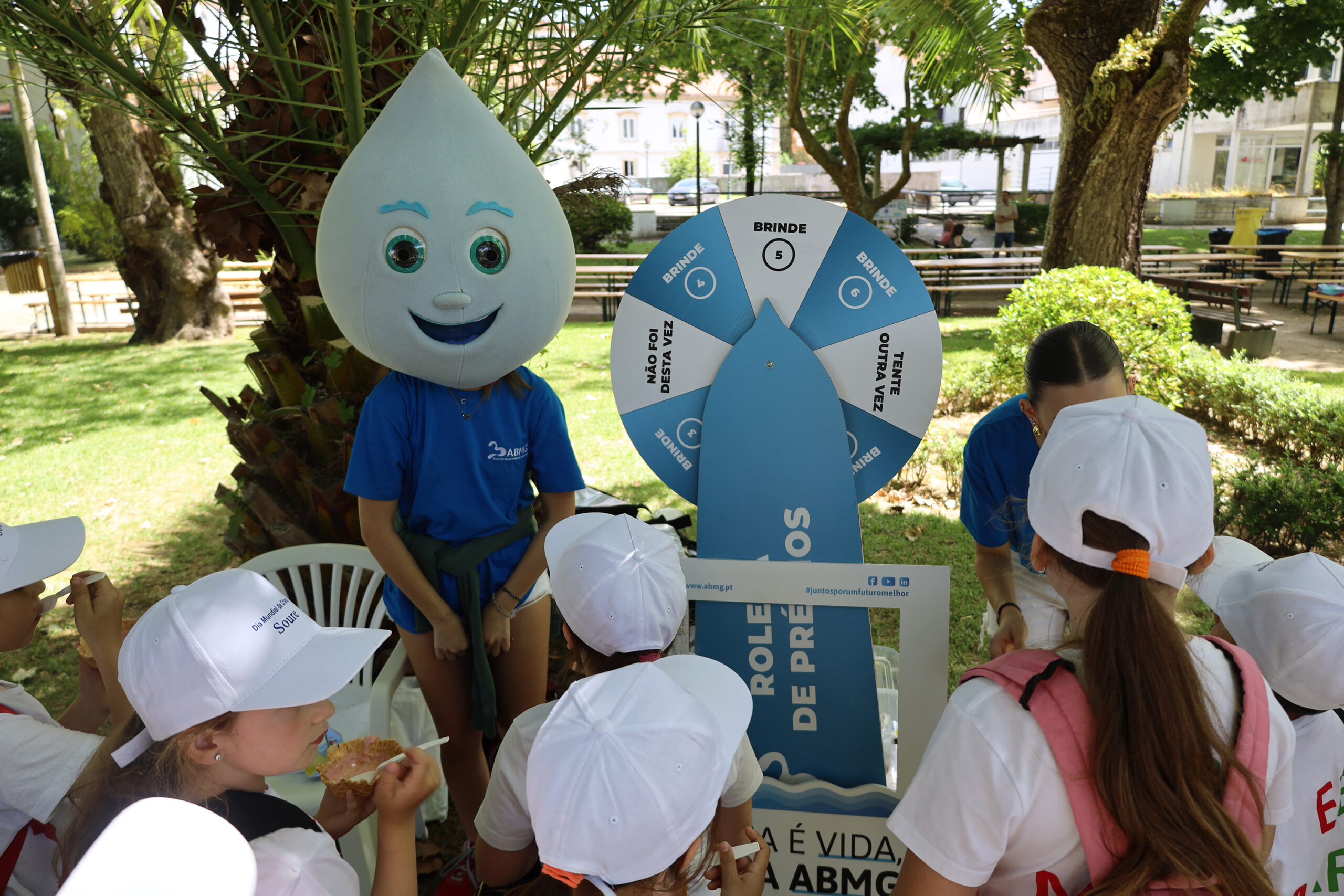Durante as celebrações, a ABMG dinamizou diversas ações interativas, com destaque para a “Roleta dos Saberes da Água” – um jogo pedagógico que incentivou as crianças a refletirem sobre comportamentos sustentáveis no seu dia a dia. A mascote “Gota” marcou presença ativa, levando alegria, dinamismo e muitas aprendizagens a todos os participantes.