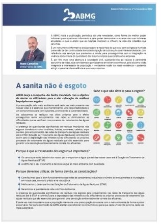 A ABMG – Águas do Baixo Mondego e Gândara inicia a publicação de uma newsletter que pretende divulgar atividades e informações das várias áreas de atuação da empresa, como campanhas de sensibilização, empreitadas e investimentos, entre outras.