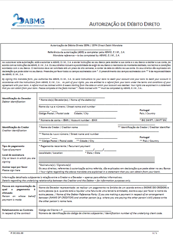 Preencha os formulários e entregue-os, por favor, nos nossos balcões de atendimento ou envie por correio eletrónico para geral@abmg.pt, acompanhado do comprovativo de identificação bancária, no caso da adesão ao pagamento por débito direto.