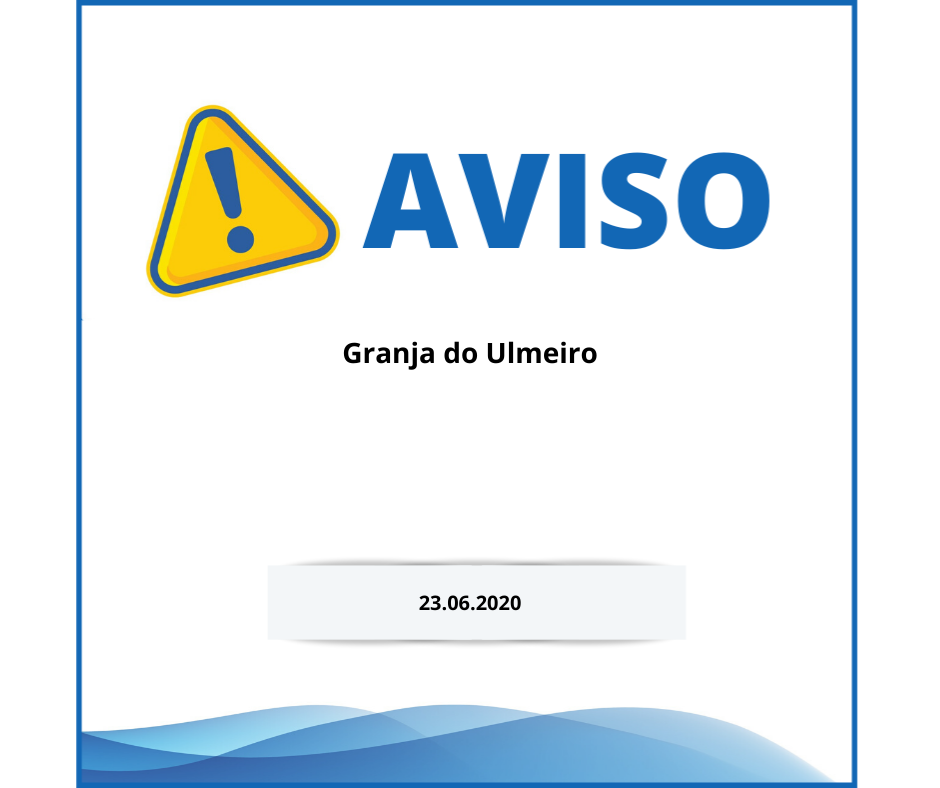 A ABMG informa os utilizadores da Granja do Ulmeiro, concelho de Soure, que poderão verificar-se períodos de interrupção do abastecimento de água, no dia 23 de junho, entre as 17h00 e as 20h00, em consequência de rotura na conduta na Rua Gabrielos – Granja do Ulmeiro.