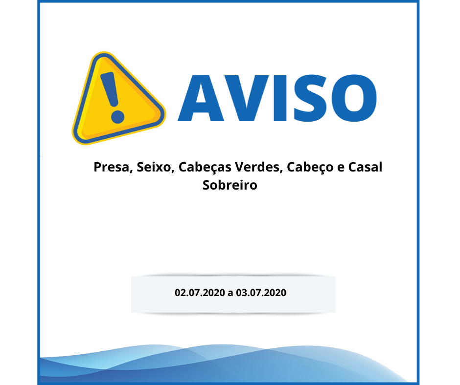 A ABMG informa os utilizadores de Presa, Seixo, Cabeças Verdes, Cabeço e Casal Sobreiro, concelho de Mira, que poderão verificar-se períodos de interrupção do abastecimento de água, no dia 2 de julho, a partir das 22h até às 08h de dia 3 de julho, em consequência de obras de beneficiação do Reservatório de Presa. Informa-se igualmente, que a água poderá apresentar alguma coloração durante o dia 3 de julho.