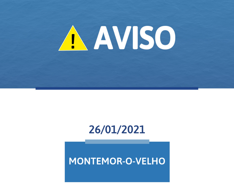Informam-se os utilizadores de Ereira, concelho de Montemor-o-Velho, que podem verificar-se períodos de interrupção do abastecimento de água, até às 17H30, do dia 26/01/2021, em consequência da reparação de uma rotura. Prometemos ser breves, obrigado.