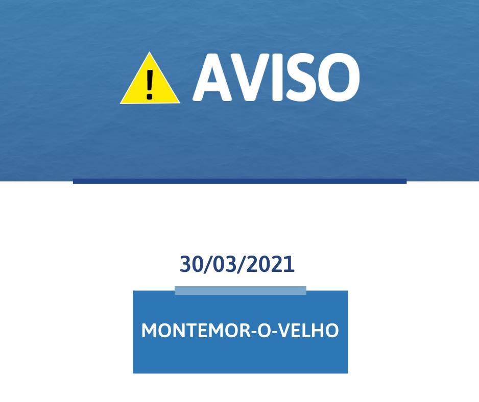 Informam-se os utilizadores de Rua dos Cesteiros, Alhastro, Casal Corso e Rua das Helenas, concelho de Montemor-o-Velho, que podem verificar-se períodos de interrupção do abastecimento de água, até às 14H00, do dia 30/03/2021, em consequência da reparação de uma rotura.