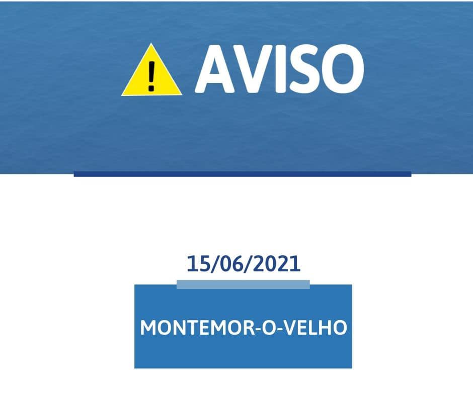 Informam-se os utilizadores de Montemor-o-Velho, concelho de Montemor-o-Velho, que podem verificar-se períodos de interrupção do abastecimento de água, das 8H30 às 10H30, do dia 15/06/2021, em consequência da reparação de uma rotura.