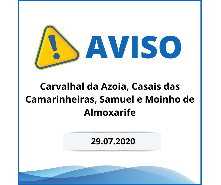 A ABMG informa os utilizadores das localidades de Carvalhal da Azoia, Casais das Camarinheiras, Samuel e Moinho de Almoxarife, concelho de Soure, que se verificam períodos de interrupção do abastecimento de água, no dia 29 de julho, a partir das 8h00 até às 20h, em consequência de uma avaria por parte da EDP Distribuição. A ABMG está a efetuar todos os esforços para implementar alternativas no abastecimento de água, por forma a minimizar os impactos provocados por esta avaria.