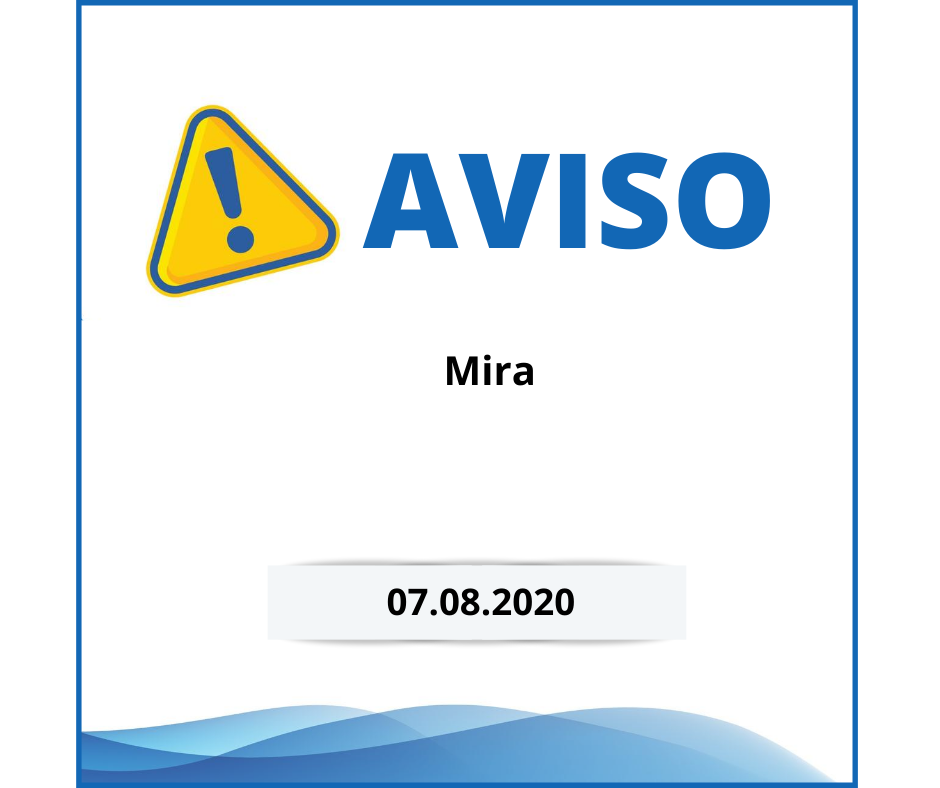A ABMG informa os utilizadores da Rua do Areal, concelho de Mira, que poderão verificar-se períodos de interrupção do abastecimento de água, durante o dia de hoje, até às 18H00, em consequência da reparação de uma rotura.