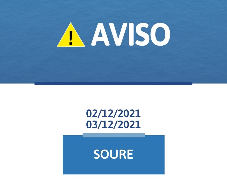 Informam-se os utilizadores de Casais de S. Jorge e Covão das Favas, concelho de Soure, que podem verificar-se períodos de interrupção do abastecimento de água, a partir de dia 2/12, às 20h00, até 3/12/2021, às 10h00, em consequência reparação de rotura.