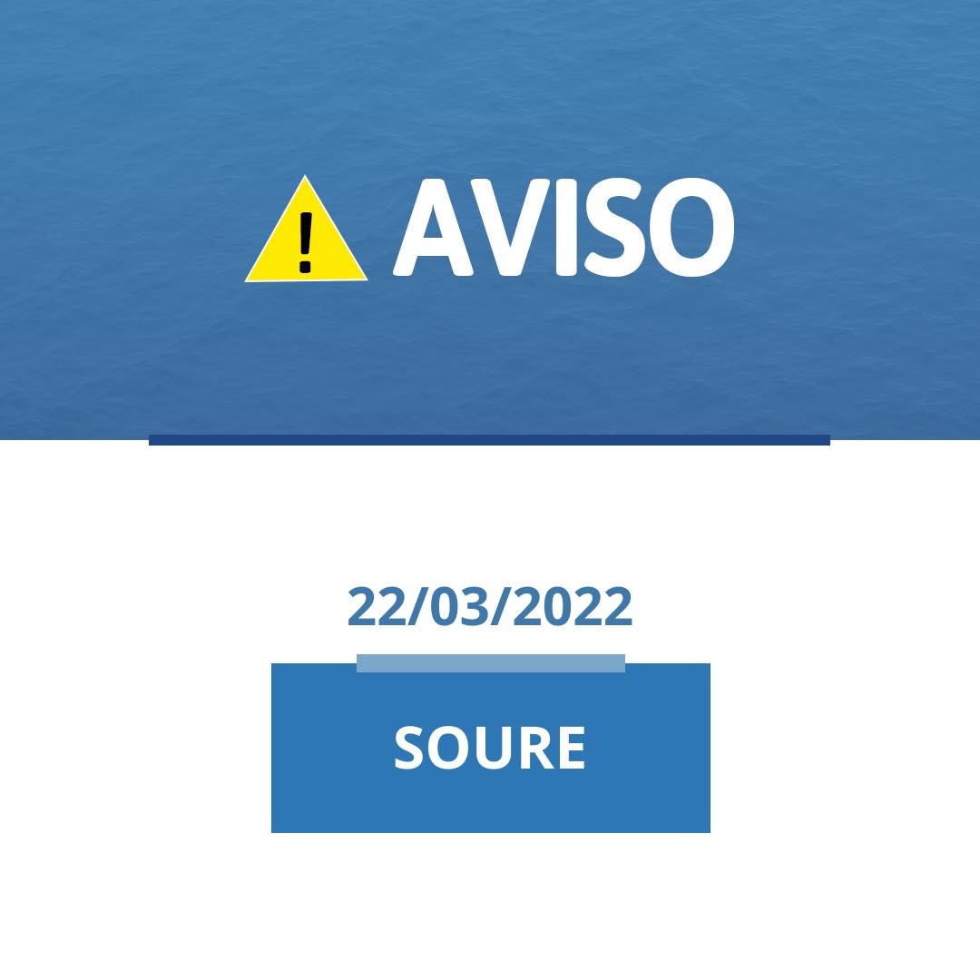 Informam-se os utilizadores de Coles de Samuel, Marco, Palhais e Casalinho, concelho de Soure, que podem verificar-se períodos de interrupção do abastecimento de água, no dia 22/03/2022, das 14H00 às 16H00, em consequência da realização da empreitada de substituição de condutas na freguesia de Samuel.