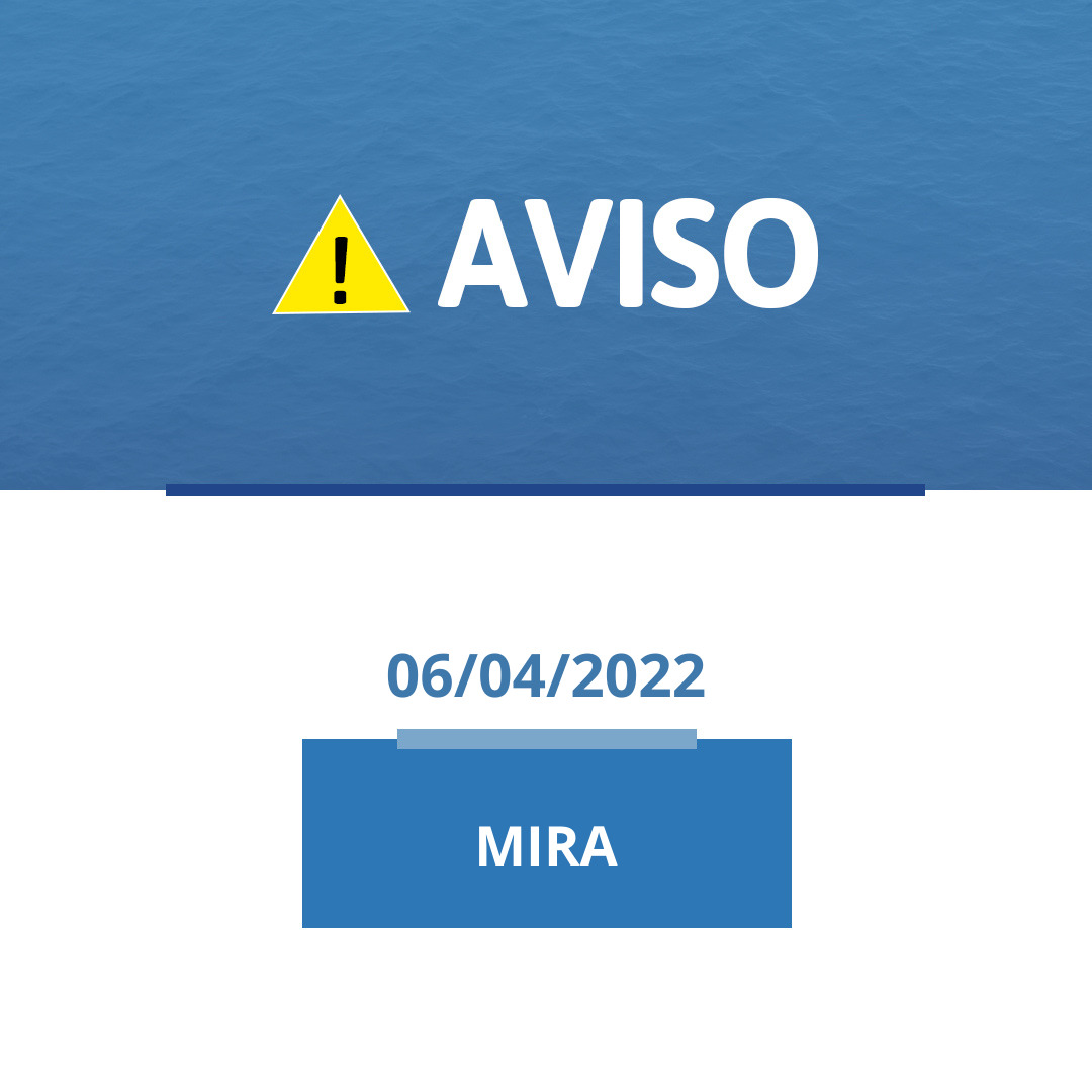 Informam-se os utilizadores da Rua Afonso Costa e Rua do Cential, concelho de Mira, que podem verificar-se períodos de interrupção do abastecimento de água, no dia 06/04/2022, até às 16H30, em consequência da substituição de válvula.