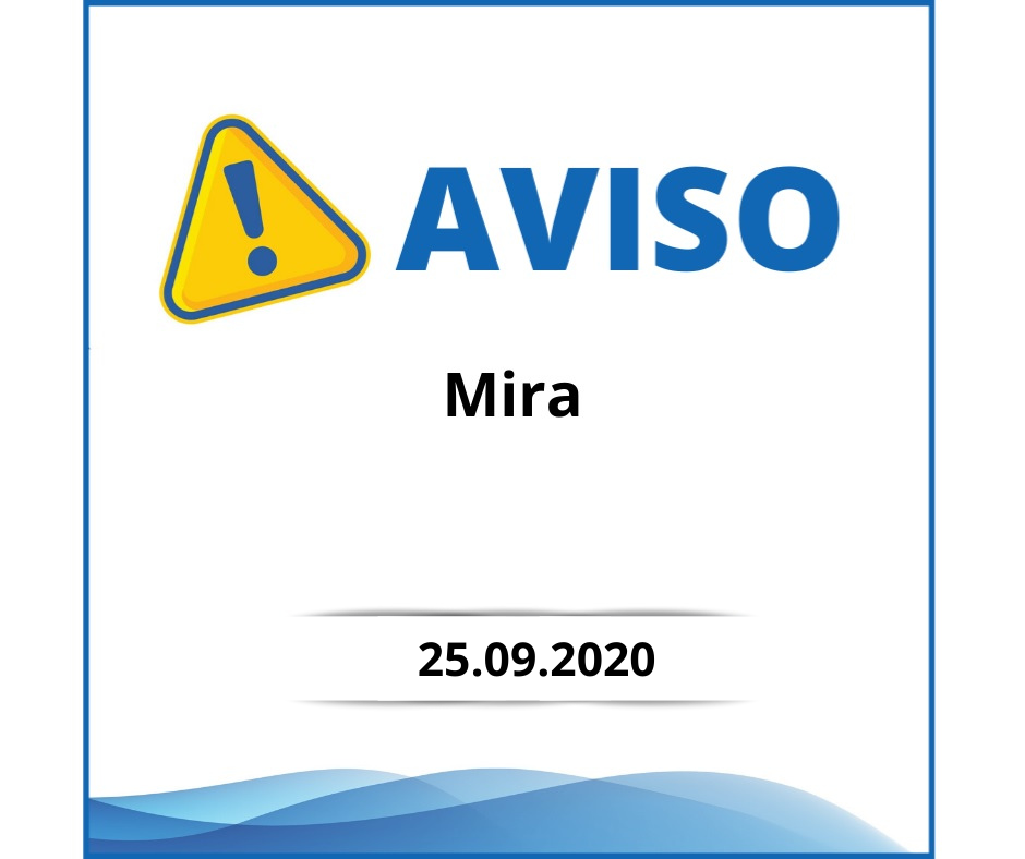 Informam-se os utilizadores Zona Industrial Polo I, Zona Industrial Polo II, Corticeiro e Carapelhos, concelho de Mira, que podem verificar-se períodos de interrupção do abastecimento de água, no dia 25/09/2020, entre as 15h00 e as 17h00, em consequência de uma rotura.