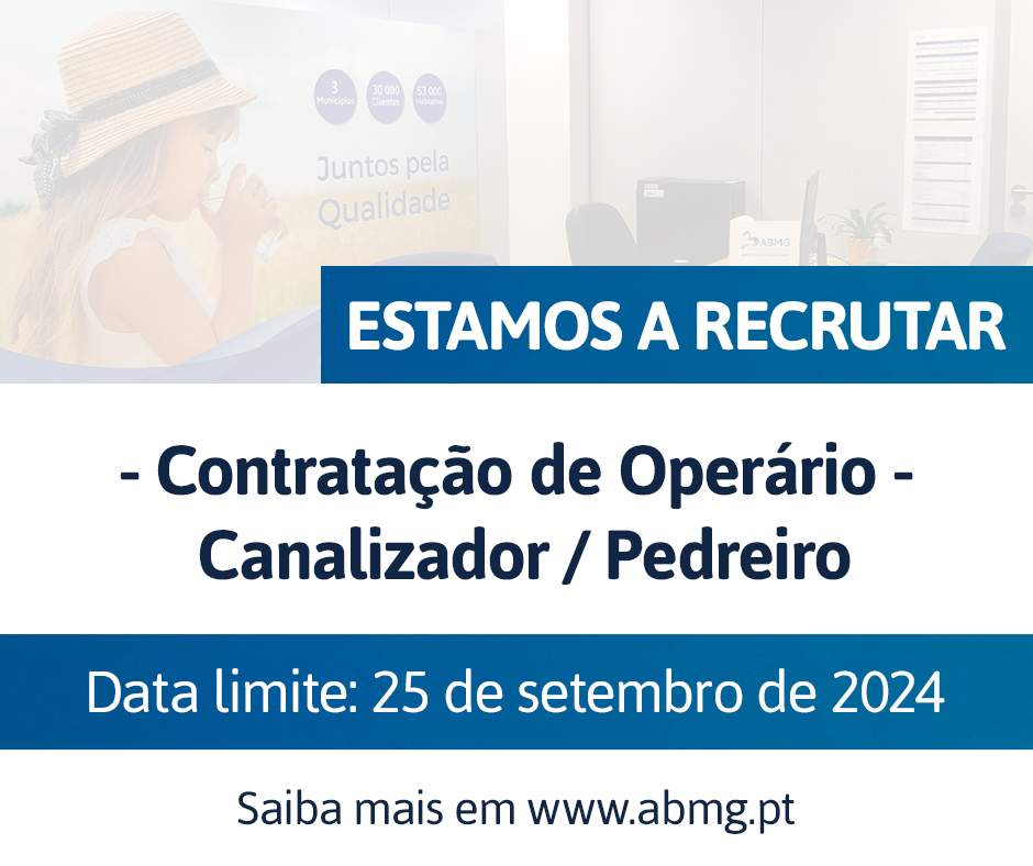 Está aberto o procedimento concursal para a constituição de um posto de trabalho (com constituição de reserva de recrutamento) para a função Operário – Canalizador/Pedreiro para a área de abrangência da ABMG, até 25 de setembro.